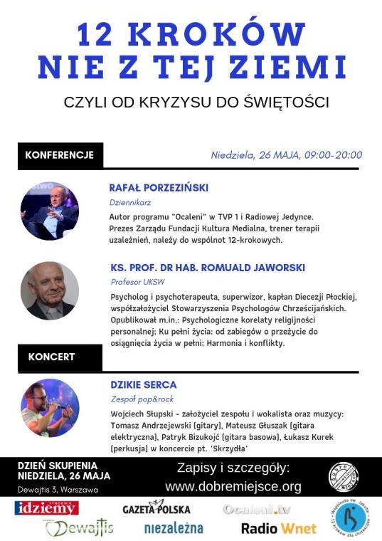 Będzie to dzień całkowitego oddania się sprawom duchowym. Przynajmniej ten jeden dzień powinniśmy poświęcić naszemu wewnętrznemu rozwojowi. Pomogą nam w tym: znany dziennikarz Rafał Porzeziński oraz ks. prof. dr hab. Romuald Jaworski. Dzień zakończy się koncertem o charakterze ewangelizacyjnym zespołu Dzikie Serca.