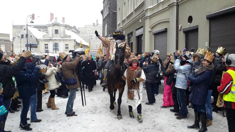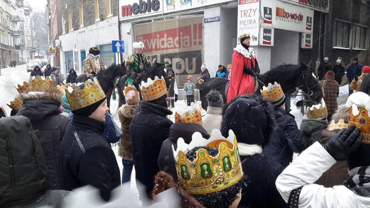 Ulicami Wałbrzycha przemaszerował dziś Orszak Trzech Króli ,organizowany jak co roku przez Fundację Orszak Trzech Króli. Współorganizatorami były władze Wałbrzycha oraz Szczawna Zdroju pod przewodnictwem Prezydenta Miasta Wałbrzycha - dr. Romana Szełemeja, wałbrzyskie parafie, a w szczególności organizacje katolickie, którym przewodniczył ks. prałat dr Krzysztof Moszumański, proboszcz parafii p.w. Niepokalanego Poczęcia NMP w Wałbrzychu. Wydarzenie rozpoczęło się o godz. 11.00 Mszą św. w parafii św. Aniołów Stróżów. Po Eucharystii przy kolegiacie uformował się orszak, który prowadzili siedzący na koniach trzej królowie: Kacper, Baltazar oraz Melchior. Orszak zatrzymał się u Heroda, który przywitał ich na wałbrzyskim Rynku. Scenka ta została odtworzona przez Prywatne Gimnazjum i Liceum Sióstr Niepokalanek w Wałbrzychu. Z Rynku trzej królowie wspólnie ze swoim orszakiem udali się do Miejskiego Ratusza, gdzie odbył się na ich cześć program wizualno-muzyczny, zorganizowany przez gimnazjum im. Korczaka w Wałbrzychu. Przemierzając ulice miasta orszak dotarł do swojego celu, tzn. do szopki Betlejemskiej. Odnalazł tam nowo narodzone dziecko z Matką Najświętszą oraz św. Józefem . Trzej królowie pokłonili się św. Rodzinie oraz wręczyli dary. Hołd, jaki złożyli Mędrcy ze Wschodu, jest znakiem, że i poganie zostali powołani do przyjęcia wiary. Część oficjalną wydarzenia zakończyły podziękowania ,złożone przez ks. prałata Krzysztofa Moszumańskiego wszystkim tym, którzy swoim zaangażowaniem przyczynili się do wspaniałej oprawy tego przedsięwzięcia. Lista była długa: począwszy od władz Wałbrzycha, Szczawna Zdroju, poprzez stadninę koni Książ, Teatr Dramatyczny im. Jerzego Szaniawskiego w Wałbrzychu, organizacji katolickich, szkół. Słowa podziękowania złożył dr Roman Szełemej, który wykorzystał tę okazję do wręczenia nagrody laureatom konkursu na najpiękniejszą szopkę Bożonarodzeniową. Około godziny 13.00 ks. prałat pobłogosławił licznie zebrane osoby. Po części oficjalnej piosenka Arki Noego "Świeć, gwiazdeczko, świeć" rozpoczęła wspólne radosne świętowanie poprzez śpiew wydarzenia przybycia trzech króli do szopki Betlejemskiej. Ulicami Wałbrzycha przemaszerował dziś Orszak Trzech Króli ,organizowany jak co roku przez Fundację Orszak Trzech Króli. Współorganizatorami były władze Wałbrzycha oraz Szczawna Zdroju pod przewodnictwem Prezydenta Miasta Wałbrzycha - dr. Romana Szełemeja, wałbrzyskie parafie, a w szczególności organizacje katolickie, którym przewodniczył ks. prałat dr Krzysztof Moszumański, proboszcz parafii p.w. Niepokalanego Poczęcia NMP w Wałbrzychu. Wydarzenie rozpoczęło się o godz. 11.00 Mszą św. w parafii św. Aniołów Stróżów. Po Eucharystii przy kolegiacie uformował się orszak, który prowadzili siedzący na koniach trzej królowie: Kacper, Baltazar oraz Melchior. Orszak zatrzymał się u Heroda, który przywitał ich na wałbrzyskim Rynku. Scenka ta została odtworzona przez Prywatne Gimnazjum i Liceum Sióstr Niepokalanek w Wałbrzychu. Z Rynku trzej królowie wspólnie ze swoim orszakiem udali się do Miejskiego Ratusza, gdzie odbył się na ich cześć program wizualno-muzyczny, zorganizowany przez gimnazjum im. Korczaka w Wałbrzychu. Przemierzając ulice miasta orszak dotarł do swojego celu, tzn. do szopki Betlejemskiej. Odnalazł tam nowo narodzone dziecko z Matką Najświętszą oraz św. Józefem . Trzej królowie pokłonili się św. Rodzinie oraz wręczyli dary. Hołd, jaki złożyli Mędrcy ze Wschodu, jest znakiem, że i poganie zostali powołani do przyjęcia wiary. Część oficjalną wydarzenia zakończyły podziękowania ,złożone przez ks. prałata Krzysztofa Moszumańskiego wszystkim tym, którzy swoim zaangażowaniem przyczynili się do wspaniałej oprawy tego przedsięwzięcia. Lista była długa: począwszy od władz Wałbrzycha, Szczawna Zdroju, poprzez stadninę koni Książ, Teatr Dramatyczny im. Jerzego Szaniawskiego w Wałbrzychu, organizacji katolickich, szkół. Słowa podziękowania złożył dr Roman Szełemej, który wykorzystał tę okazję do wręczenia nagrody laureatom konkursu na najpiękniejszą szopkę Bożonarodzeniową. Około godziny 13.00 ks. prałat pobłogosławił licznie zebrane osoby. Po części oficjalnej piosenka Arki Noego "Świeć, gwiazdeczko, świeć" rozpoczęła wspólne radosne świętowanie poprzez śpiew wydarzenia przybycia trzech króli do szopki Betlejemskiej.