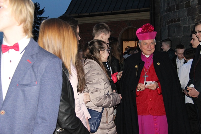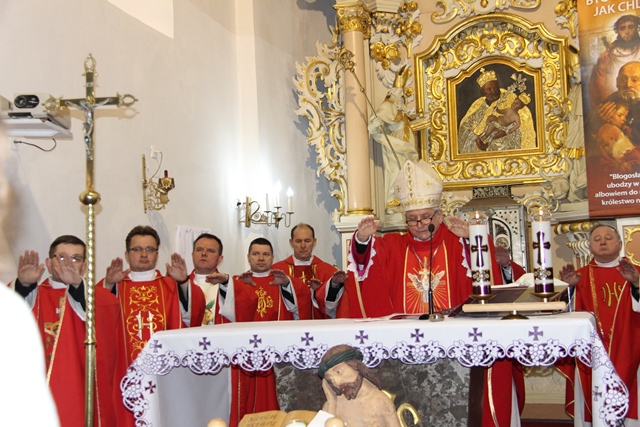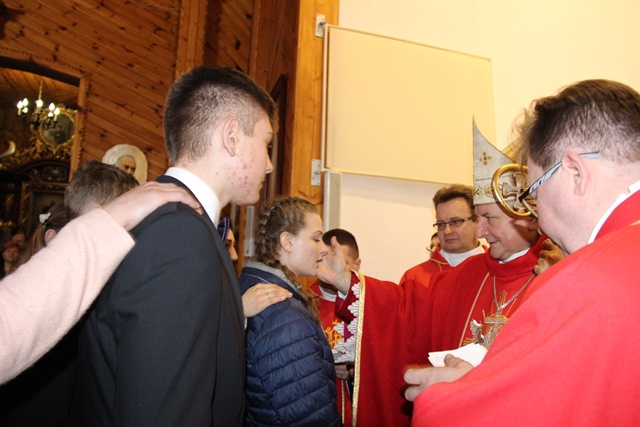 W homilii ordynariusz diecezji kaliskiej podziękował proboszczowi, wikariuszowi i parafianom za troskę o świątynię i kaplice filialne. - Ta troska duszpasterska jest najważniejsza, bo zobaczcie ile tu pokoleń ludzi przeszło. Te mury są przesiąknięte modlitwą, ale także łzami i radością. Mamy świadomość, że wszyscy zdążamy w jednym kierunku, czy to się komuś podoba, czy nie, ale będąc tutaj chcemy zapracować na wieczność – przekonywał bp Janiak. Zwracając się do młodzieży wskazywał, że sakrament bierzmowania zobowiązuje, aby mieć odwagę bronić wiary, gdy zajdzie taka potrzeba. - Wiara jest łaską. Papież Franciszek przed rozpoczęciem Wielkiego Postu w katechezie mówił, że wszystko jest łaską. My dzisiaj chcemy dziękować Panu Bogu za łaskę wiary, za to, że zostaliśmy włączeni do Kościoła. Chcemy modlić się, byście dochowali wierności Panu Bogu i byście wiarę otrzymaną przekazywali innym – mówił celebrans. Prosił o modlitwę w intencji prześladowanych za wiarę. - Chcemy pamiętać o tych, którzy oddają życie na misjach. Tyle ludzi ginie za wiarę, za przyznanie się do krzyża Chrystusowego, za posiadanie tekstów Pisma Świętego. My żyjemy w kraju wolnym, mamy przystęp do Kościoła, do sakramentów świętych, do Słowa Bożego, tylko potrzebna jest chęć i gorliwość człowieka – stwierdził biskup kaliski.