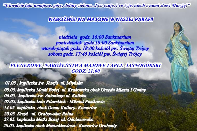 Przed nami jeden z najpiękniejszy miesiąc, maj. Cieszy oczy zieleń łąk i kolor rozkwitających kwiatów, krzewów, łąk. Ale jest on piękny jeszcze z jednego powodu - to miesiąc w sposób szczególny poświęcony Maryi. Kochają Polacy swoja Matkę i Królową , kochają Ja i czczą mikstaccy parafianie. W kościołach odprawiane są nabożeństwa majowe.Przy kapliczkach i przydrożnych krzyżach, których tak wiele jest w naszym kraju gromadzą się wierni, by słowami Litanii Loretańskiej wychwalać Maryję. Na nabożeństwach majowych gromadzą się także w parafialnym kościele mikstaccy parafianie. Stało się już tradycją w mikstackiej wspólnocie,że w soboty maja wyruszymy z Maryją na szlak, by nawiedzić kapliczki w miejscowościach wchodzących w skład parafii i tam oddawać Jej cześć. Spotykamy się o godz. 21:00 i łączymy Apel Jasnogórski z nabożeństwem majowym. Podczas tego kapliczkowego pielgrzymowania szczególnego znaczenia nabierają słowa pieśni " i co czuje i co żyje niech z nami sławi Maryję". Sławi wraz z nami Maryję cała przyroda wiatr szumem, ptaki śpiewem. A wraz z nim ku niebu popłyną nasze radości i troski, prośby i podziękowania, które przynosić będziemy na nasze plenerowe, modlitewne majowe spotkania. A któż lepiej niż Ona nas zrozumie...Wiec jeśli chcesz wraz z nami powiedzieć Matce: Maryjo, Królowo Polski, jestem, pamiętam, czuwam!