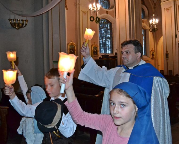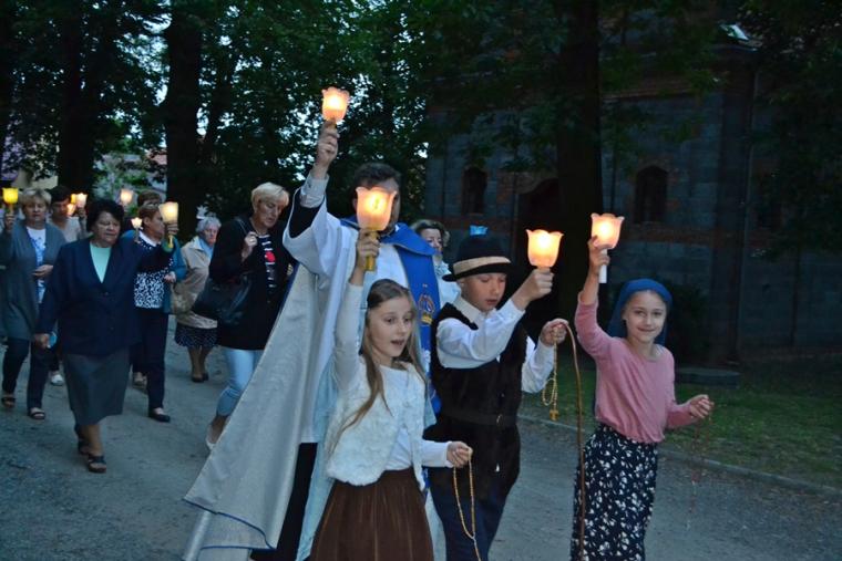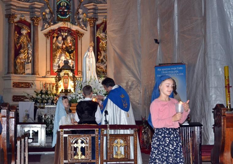 W rozważaniu poprzedzającym modlitwę różańcową ks. kan. Krzysztof przybliżył parafianom stan serc fatimskich pastuszków. Podkreślił, że byli  oni posłuszni swoim rodzicom, pełni prostoty i czystości. Jak wskazał, to zapewne było powodem tego, że to właśnie im Maryja powierzyła misje zaniesienia światu swego przesłania. W dalszej części rozważania ks. kanonik  przypomniał uczestnikom modlitewnego spotkania treść drugiego objawienia. Zaakcentował rolę i znaczenie ustanowienia nabożeństwa do Niepokalanego Serca Maryi. Podkreślając znaczenie wspólnoty i pracy nad sobą powiedział m.in. „ Nasza parafialna wspólnota ma również swoje serce. Ono bije  w każdym z nas. Wciąż uczymy się jaką powinniśmy być wspólnotą. Zadania te wynikają z naszego chrztu. Ponieważ jednak nasza ludzka natura skłonna jest do grzechu, dlatego wciąż modlimy się , pracujemy nad sobą, aby nasze serca były podobne do Serca Pana Jezusa i Niepokalanego Serca Maryi”.  Ks. kan. podkreślił, że w wielu miejscach, gdzie miały miejsce objawienia Matki Bożej gromadzą się tłumy wiernych, którzy chcą dotknąć tajemnicy Niepokalanego Serca Maryi.  Kończąc rozważanie ks. kan. powiedział:  „ My zgromadzeni na nabożeństwie fatimskim odmawiamy różaniec, śpiewamy pieśni maryjne, prosimy Maryję o wstawiennictwo u Trójjedynego Boga we wszystkich naszych potrzebach. Tym samym jesteśmy wspólnotą , której  celem jest sam Bóg”. Po zakończeniu rozważania rozpoczęliśmy modlitwę różańcową. Przy pięknie przyozdobionej figurze Pani Fatimskiej nie mogło zabraknąć pastuszków. W ich postacie wcieliły się dzieci z naszej parafii. Ku niebu popłynęła modlitwa, o którą nieustannie prosiła i prosi Maryja… W kontemplowaniu tajemnic różańca pomocne były rozważania ks. kanonika. Przed rozpoczęciem czwartej tajemnicy ks. kan. od świecy płonącej przy figurze odpalił świece pastuszków. Ci zanieśli to światło do uczestników nabożeństwa. Po zakończonej  modlitwie różańcowej wyruszyliśmy w procesji z figurą Fatimskiej Pani  zapalonymi świecami wokoło kościoła. Podczas procesji rozległo się bicie dzwonów w mikstackiej świątyni. Wzywają nas one i przypominają codziennie od dnia nawiedzenia o  Apelu Jasnogórskim. Gdy procesja powróciła do kościoła w duchowej łączności z Jasną Górą  śpiewaliśmy: Maryjo jestem, pamiętam, czuwam! Po końcowym błogosławieństwie wierni otoczyli figurę Fatimskiej Pani i zaśpiewali pieśń „ Zapada zmrok…”. Wypowiedziane  z życzliwością i uśmiechem słowa „ Dobrze, że jesteś”   do osób stojących najbliżej nas uświadomiły nam, że naprawdę jesteśmy wspólnotą. I jeszcze jedna refleksja. Pięknie prezentowała się udekorowana kwiatami Fatimska Pani, ale co najważniejsze otoczona była sercami kochających Ją ludzi.