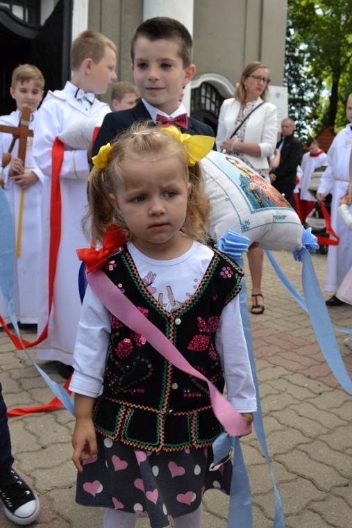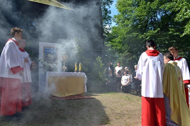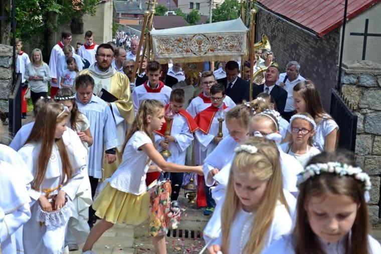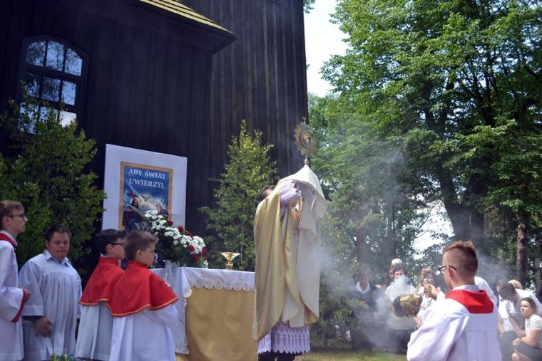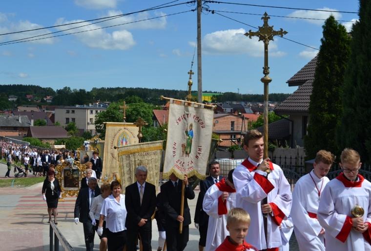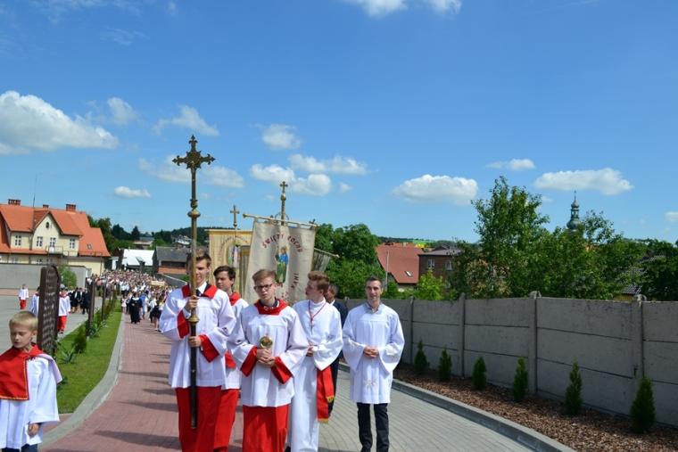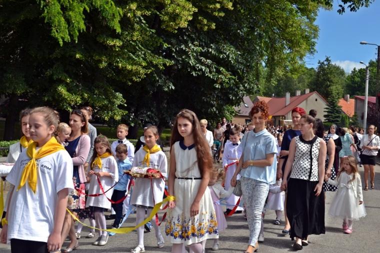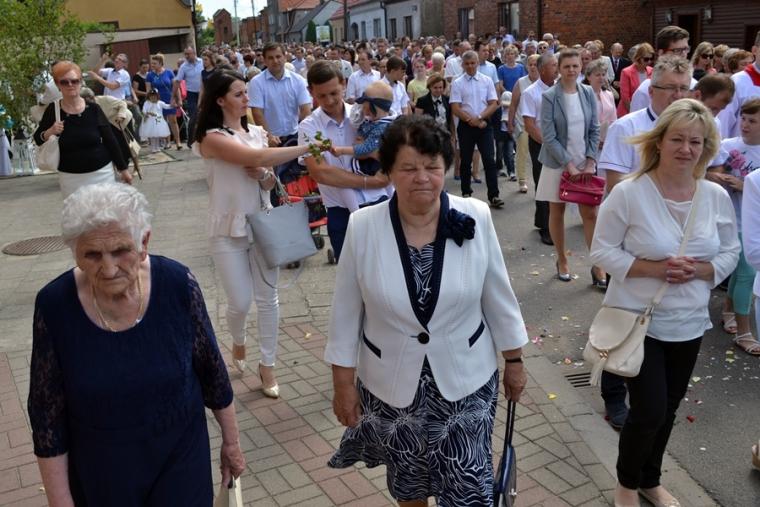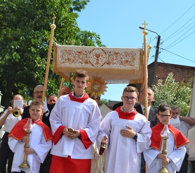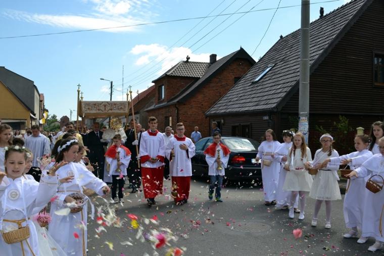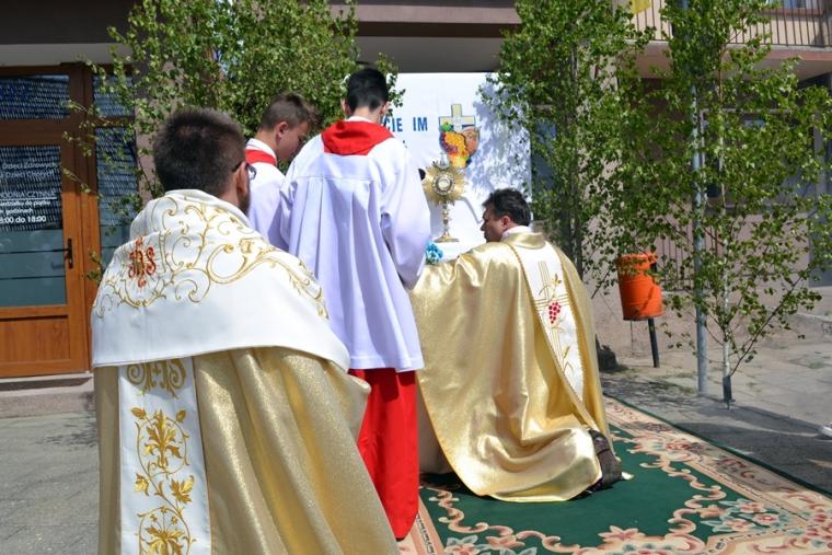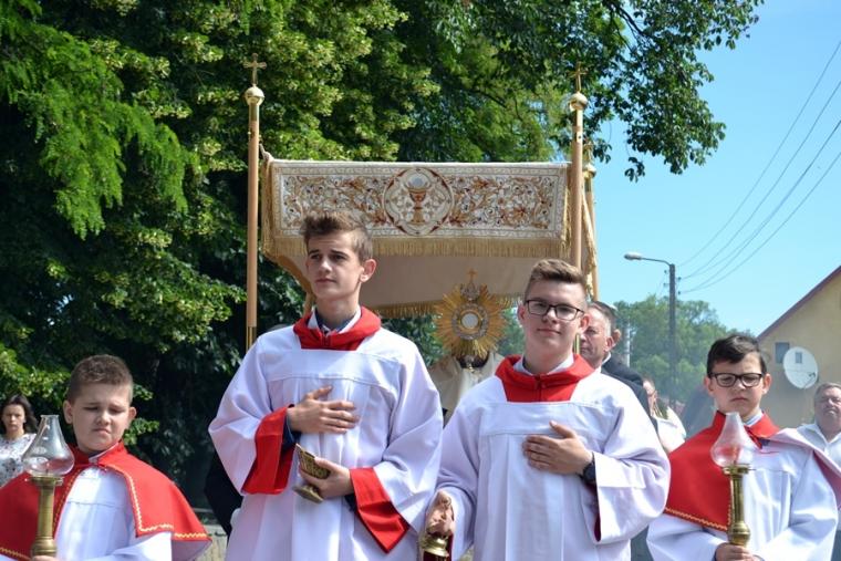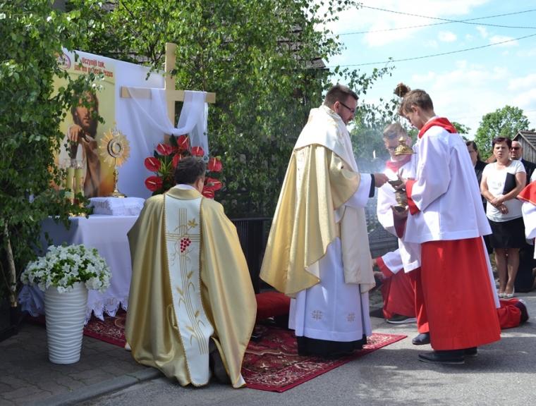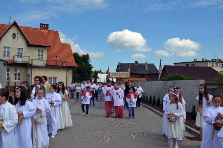 Po Mszy Świętej przed wystawionym Najświętszym Sakramentem, odmówiliśmy Litanię do Serca Jezusowego. Następnie wraz z Jezusem ukrytym pod postacią Chleba wyruszyliśmy w procesji do czterech ołtarzu. Krzyż, chorągwie, feretrony, poduszki z emblematami religijnymi niesione przez dzieci poprzedzały w procesji Jezusa ukrytego pod postacią Chleba niesionego w monstrancji. Tuż przed kapłanem niosącym monstrancje szły dziewczynki sypiące kwiatki. Pięknie przygotowane zostały ołtarze.