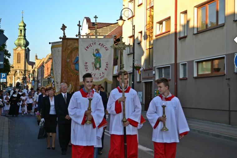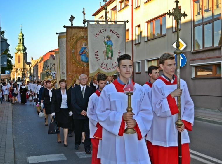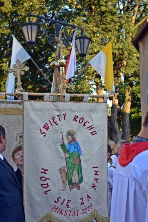 Uroczystości odpustowe ku czci św. Rocha to jedno z najważniejszych wydarzeń w roku w mikstackiej wspólnocie parafialnej. Już 7 sierpnia rozpoczęły się duchowe przygotowania do tej uroczystości. Młodzi parafianie spotykali się w Szkole św. Rocha. Wielu parafian codziennie o godz. 18:30 uczestniczyło we Mszy św. połączonej z Nowenną do św. Rocha. W przedodpustowych dniach nauki rekolekcyjne głosił ks. kan. Bogumił Kempa. W uroczystość Wniebowzięcia Matki Bożej o godz. 18:00 w kościele farnym sprawowana była Msza św. podczas której wysłuchaliśmy ostatniej nauki rekolekcyjnej. Ks. Bogumił podkreślał w niej miłość Boga do człowieka. Zaakcentował, że Bóg wybierając Maryję na Matkę Jezusa chciał być blisko człowieka. Nawiązując do Święta Wojska Polskiego zapytał o jaką Polskę walczyli i za jaką Polskę ginęli nasi rodacy. Podkreślił, że powinniśmy być dumni z tego, że jesteśmy Polakami, z tego że mamy, tu w Mikstacie naszego świętego Rocha. Podkreślił znaczenia tradycji w życiu wspólnoty. Wiele ważnych słów skierował do nas podczas rekolekcyjnych nauk, zachęcających do przemiany życia, pracy nad sobą, do naśladowania naszego niebieskiego Patrona. Z pewnością pomogły nam one w przygotowaniu pięknego, szczególnego odpustowego czasu. A ten właśnie w Diecezjalnym Sanktuarium Świętego Rocha w Mikstacie trwa. Po Mszy św. z kościoła farnego wyruszyła uroczysta procesja z Najświętszym Sakramentem i relikwiami niebieskiego Patrona na Wzgórze Mikstackie, gdzie znajduje się Diecezjalne Sanktuarium Świętego Rocha. W procesji uczestniczyli kapłani posługujący na co dzień w mikstackiej wspólnocie, z niej pochodzący oraz liczna rzesza parafian, gości i pielgrzymów. Z feretronami, sztandarami przy dźwiękach orkiestry parafialnej przeszliśmy na miejsce głównych uroczystości. Po przybyciu do Sanktuarium odśpiewane zostały uroczyste nieszpory i odprawiona Nowenna do Świętego Rocha. Po Nowennie rozpoczęło się całonocne czuwanie modlitewne. Wiele osób w tej nocnej ciszy zapewne nawiedzi Sanktuarium, by z Jezusem ukrytym w Najświętszym Sakramencie i naszym patronem Świętym Rochem podzielić się swoimi radościami i troskami, by podziękować za otrzymane łaski i prosić o dalszą opiekę i wsparcie.