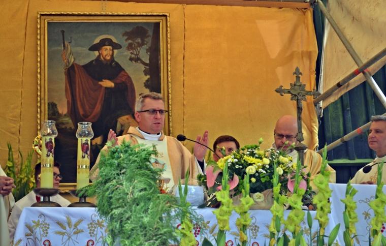 Rozpoczynając homilię podkreślił, że gromadzi nas tu św. Roch i postawił pytanie co przyciąga ludzi do tego patrona, który żył ponad siedemset lat temu. Ks. Biskup wskazał, że przyzywany jest on jako patron przed różnymi chorobami, ale jest także tym, który chroni przed nimi zwłaszcza zwierzęta. Hierarcha podkreślił, urok św. Rocha, który stanowił inspiracje dla artystów i pisarzy. Z naciskiem podkreślił, że w świecie jest ponad trzy tysiące kościołów pod wezwaniem św. Rocha, w Polsce ponad 60, w tym w Mikstacie. W dalszej części homilii kaznodzieja przybliżył postać św. Rocha, zaznaczając, że mało znamy faktów na temat Jego życia. Podkreślił, iż pewnością św. Roch był człowiekiem, który w życiu realizował słowa błogosławieństw. Zaakcentował, że po śmierci rodziców Roch rozdał majątek i wyruszył w pielgrzymkę do Rzymu. Ks. Biskup zwrócił uwagę, że każdy z nas jest pielgrzymem w drodze do celu ostatecznego, ale św. Roch uczynił pielgrzymowanie programem swego życia. Jak podkreślił kaznodzieja św. Roch był prawdziwym chrześcijaninem przenikniętym miłością do bliźniego. W czasie Jego pielgrzymowania w wielu miejscach panowały epidemie, było wiele osób potrzebujących pomocy. Roch nie przechodził obojętnie obok nich, ale pochylał się nad nimi, poświęcał swój czas. Nawiązując do obrazu przedstawiającego św. Rocha z odsłon etą raną na nodze ks. biskup wyjaśnił, że jest ona symbolem choroby. „W tej chorobie przychodzi św. Rochowi z pomocą ktoś z góry- anioł, ale zaraz też z tą pomocą przychodzi inny wysłannik, Boży wysłannik , mianowicie zwierzę, pies”- kontynuował kaznodzieja. Nawiązując do odbywającego się w Mikstacie obrzędu błogosławieństwa zwierząt Bp Stanisław podkreślił jego niezwykły urok, akcentując, że gromadzi on świat zwierzęcy i ludzki. Powiedział: „ Ludzie jakby tworzyli drogę, którą poruszają się zwierzęta jakby w procesji. Tu visa a vis obrazu św. Rocha po błogosławieństwo, po pomoc po te pomoc, którą św. Roch wyraża w środowisku ludzi wierzących jako ochrona przed chorobami, zwłaszcza zakaźnymi”. Kontynuując, ks. biskup podkreślił, różnorodność zwierząt, z którymi właściciele przybywają na obrzęd błogosławieństwa. Zaakcentował, że Mikstat stał się znany właśnie dzięki obrzędowi błogosławieństwa zwierząt. Podkreślił rolę mediów w promocji miasta i kultu św. Rocha.