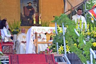 Czas wielkiego świętowania rozpoczął się procesją z Najświętszym Sakramentem i relikwiami Świętego Rocha z kościoła farnego do sanktuarium, zakończył jej powrotem. Zanim procesja z Najświętszym Sakramentem wyruszyła z sanktuarium do fary wyjątkowo gwarno zrobiło się wokół niego. W dniu uroczystości odpustowych przybyły wraz ze swoimi rodzicami do św. Rocha dzieci. Tu o godz. 18:00 ks. kan. Bogumił Kempa sprawował w ich intencji Mszę święta oraz skierował do wiernych rozważanie. Krótko po rozpoczęciu Eucharystii zaczął padać deszcz. Ksiądz Bogumił zaprosił dzieci, by zgromadziły się przy ołtarzu, bo zostało nad nim przygotowane zadaszenie. Na początku homilii kaznodzieja powiedział, że pierwszy raz głosi ją w takim towarzystwie. Wyraził radość z obecności tak wielu dzieci w sanktuarium u św. Rocha. Podkreślił, że dzieci przybyły tu po błogosławieństwo, które czyni człowieka szczęśliwym. Wyjaśniając istotę błogosławieństwa powiedział: „ Jeżeli błogosławię, to znaczy życzę komuś dobrze, życzę mu szczęścia. Przyszły tutaj te dzieci, aby mogły dostać Boże szczęście, dlatego tak ważna drodzy rodzice jest wasza obecność tutaj”. O tym jak ważne jest to, by rodzice błogosławili swoje dzieci mówił kaznodzieja w dalszej części rozważania. Zachęcał, by rodzice jak najczęściej błogosławili swoje dzieci. Dając świadectwo powiedział, że jego rodzice nadal błogosławią go, gdy wraca do domu, bądź z niego wyjeżdża. Stwierdził, że ważne jest to błogosławieństwo, bo uświadamia nam, że tylko Chrystus może dać nam prawdziwe szczęście. Nawiązując do postaci św. Rocha powiedział: „ Ten nasz wspaniały Patron, którego czcimy już od tylu dni jest tego dowodem. Ten człowiek doświadczył i cierpienia i złośliwości, doświadczył uwięzienia, doświadczył choroby. Doświadczył tego, że tak wielu ludzi się od niego odwróciło. A jednak jest błogosławiony, jest szczęśliwy”. W dalszej części rozważania ks. Bogumił zachęcał i prosił rodziców,aby uczestniczyli z dziećmi we Mszy św. i pokazywali im jak jest ona ważna. Podkreślił ponadto znaczenie przykładu rodziców i zachęcał, by klękali do modlitwy i uczyli jej swoje dzieci. Kończąc homilię kaznodzieja powiedział: „ Niech Boże błogosławieństwo z tego miejsca, z tego sanktuarium spływa na was, na wasze rodziny, na wszystkie dzieci, także na te nienarodzone, bo widzę że i takie też tu są. Niech Pan Bóg wam wszystkim błogosławi”. Została odmówiona specjalna modlitwa, a następnie kapłani udzielali dzieciom indywidualnego błogosławieństwa. Na pamiątkę spotkania u św. Rocha dzieci otrzymały obrazki. Były też i dla nich słodycze.