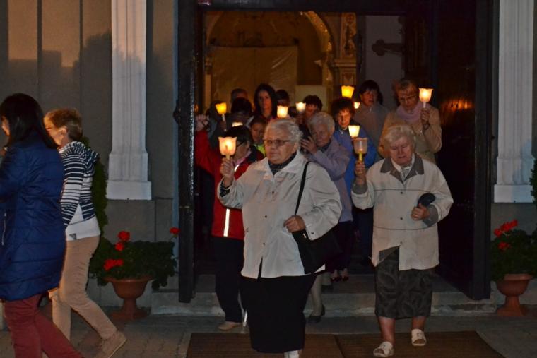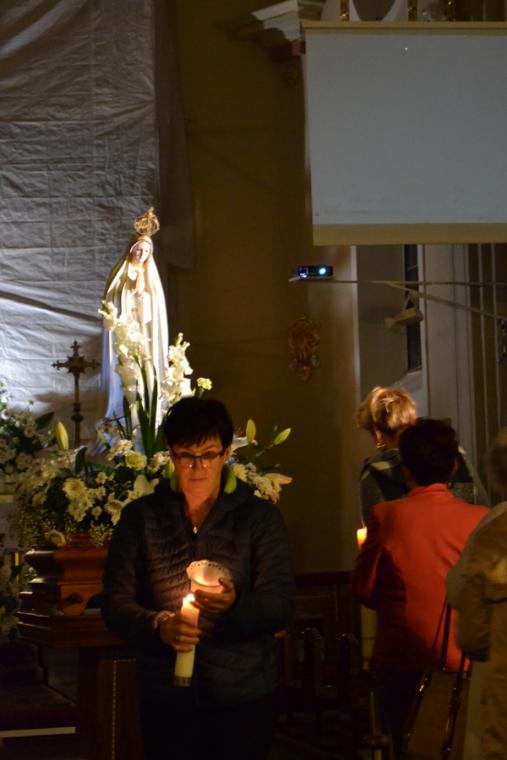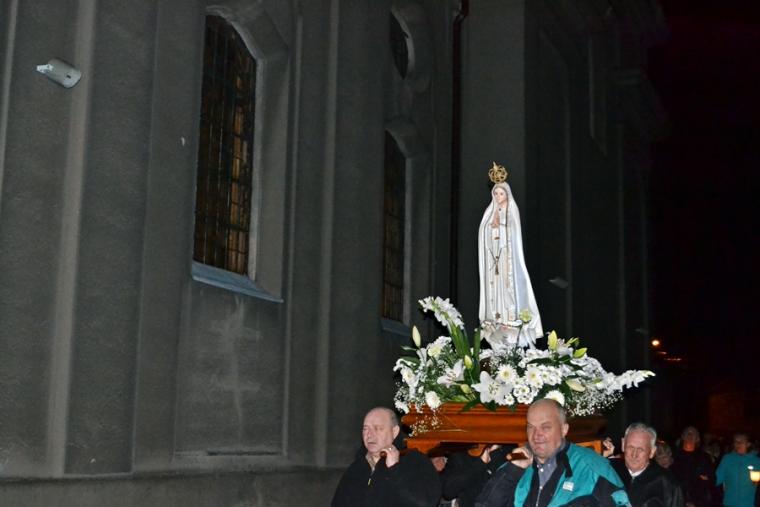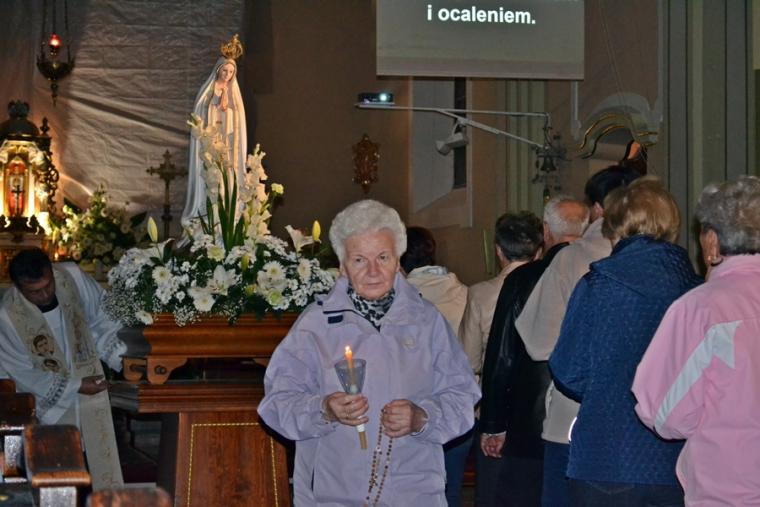Kolejne postanowienia dotyczyły codziennej modlitwy do Ducha Świętego, a także obrania Maryi za Królową naszych serc. Podczas odmawiania piątej tajemnicy w świątyni zapłonęły lampiony przyniesione przez wiernych. Zostały one zapalone od świecy jubileuszowej  stojącej przy figurze Fatimskiej Pani. Następnie odmówiliśmy  modlitwę Anioła i ze śpiewem na ustach z zapalonymi lampionami wyruszyliśmy  figurą Fatimskiej Pani z procesją wokoło kościoła. W tym czasie rozległ się dźwięk dzwonów, który przypomina nam o tym, by stanąć do Apelu Jasnogórskiego. Towarzyszy nam on od czasu nawiedzenia naszej parafii przez Czarną Madonnę w 2011 roku. Po powrocie do kościoła został odśpiewany Apel Jasnogórski . Maryjo: jesteśmy, pamiętamy, czuwamy- to wyznanie popłynęło ku niebu z naszego parafialnego wieczernika.  Modlitwą w ten wieczór objęliśmy także zgromadzonych w polskiej Fatimie na zakopiańskich Krzeptówkach Kustoszy Sanktuariów i uczestników Międzynarodowego  Kongresu Maryjno- Mariologicznego.