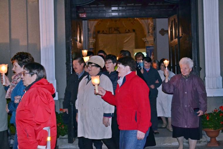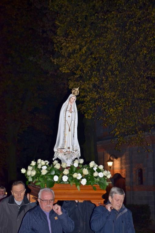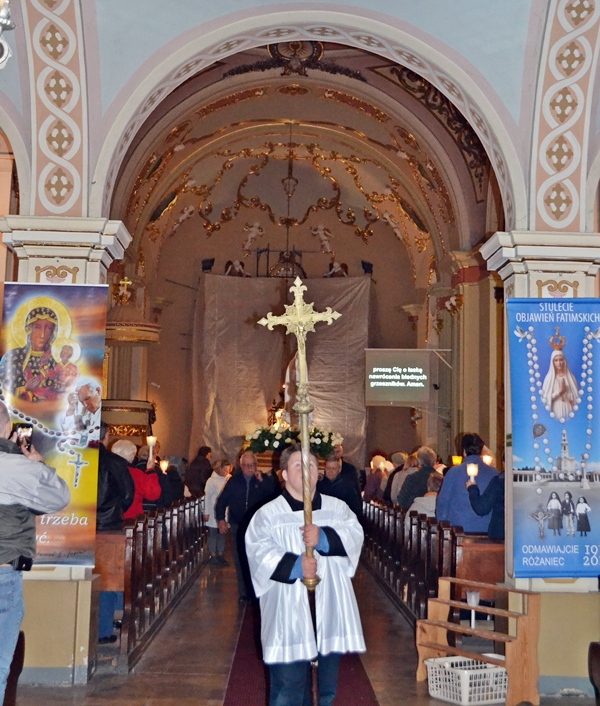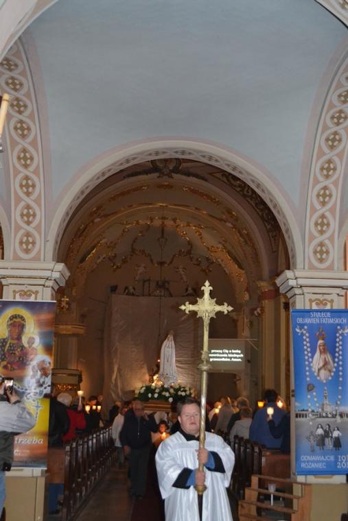 Po zakończeniu modlitwy różańcowej za krzyżem i figurą Matki Boże Fatimskiej ze śpiewem na ustach, z płonącymi lampionami wyruszyliśmy w procesji wokół kościoła. Po powrocie procesji do kościoła w łączności duchowej z Jasną Górą zaśpiewaliśmy Apel Jasnogórski. Ku niebu popłynęły słowa: Maryjo: jestem, pamiętam, czuwam.