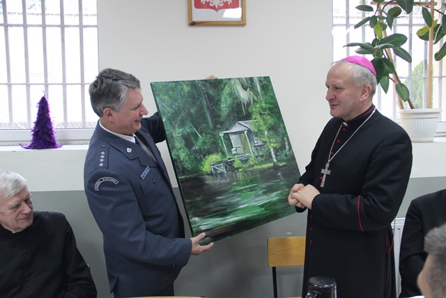 Pracownicy aresztu ofiarowali biskupowi obraz przedstawiający pejzaż wykonany przez jednego z aresztantów. Bp Łukasz Buzun poświęcił też replikę obrazu św. Rocha z Mikstatu oraz krzyż Chrystusowy wykonany z drzewa przez funkcjonariuszkę służby więziennej. Dzieła te będą zdobiły kaplicę, w której odprawiane są Msze św.