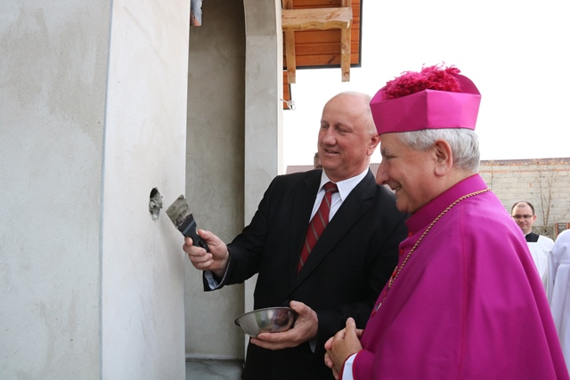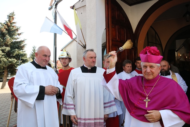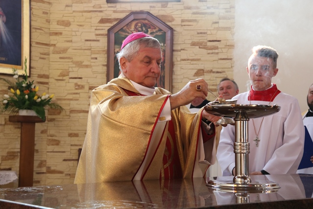 Biskup kaliski poświęcił także ołtarz św. Wawrzyńca, obraz Świętej Rodziny i nowe witraże, a także wmurował ziemię z Jerozolimy w ścianę powstającej Kaplicy Miłosierdzia Bożego.
