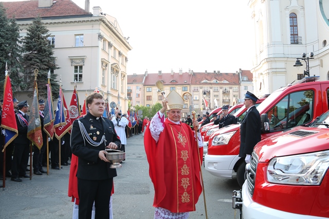 Po Mszy św. bp Janiak poświęcił 10 nowych wozów strażackich przekazanych strażakom z południowej Wielkopolski. W całej Wielkopolsce zakupiono 30 nowych pojazdów.