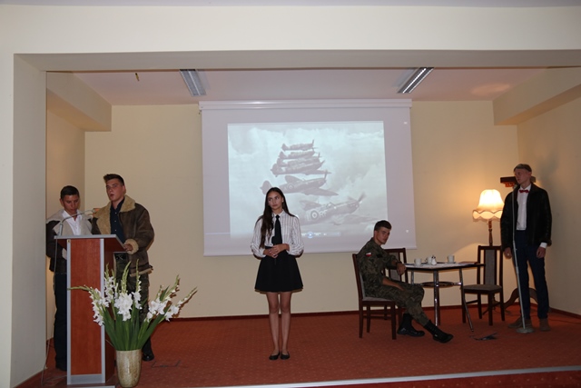 Zebrani w szkole mieli okazję obejrzeć program artystyczny w wykonaniu uczniów przedstawiający działalność Dywizjonu 303.