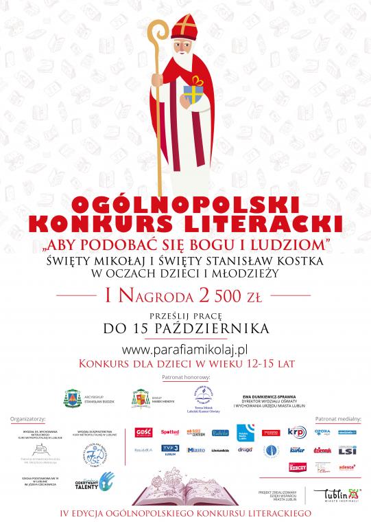 Rozpoczęto IV edycje ogólnopolskiego konkursu plastyczno-literackiego organizowanego przez parafię pw. św. Mikołaja w Lublinie. Konkurs wpisuje się w tradycyjne już lubelskie wydarzenie – Orszak św. Mikołaja. Jest on adresowany do uczniów klas siódmych i ósmych szkół podstawowych, oddziałów gimnazjalnych oraz uczniów klas I-III. Na zwycięzców czekają atrakcyjne nagrody finansowe w wysokości 2500 zł, 1500 zł i 1000 zł, warto, więc spróbować swoich sił w obszarze plastycznym lub literackim. Prace konkursowe będą przyjmowane do 15 października 2018 r.