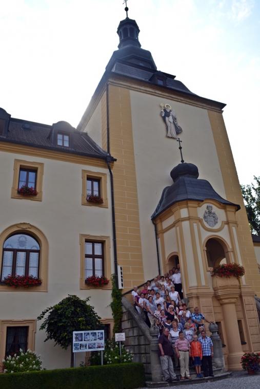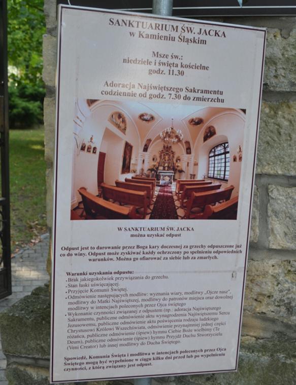 Kolejnym miejscem, które nawiedziliśmy był Kamień Śląski. Tu na świat przyszedł przyszły święty Jacek Odrowąż, bł. Czesław i bł. Bronisława. Kaplica poświęcona św. Jackowi powstała w XVIII wieku. Zachwyca swoim wystrojem. W centralnym punkcie ołtarza umieszczona jest statua św. Jacka. Po jej bokach znajdują się figury bł. Czesława i bł. Bronisławy. Na sklepieniu kaplicy podziwiać można przepiękne malowidła przedstawiające cztery sceny z życia Maryi: „Zwiastowanie", „Narodziny Jezusa w Betlejem", „Ofiarowanie Jezusa w świątyni", „Śmierć Maryi-Wniebowzięcie". W kaplicy codziennie od rana do zmierzchu odbywa się adoracja Najświętszego Sakramentu. Oczywiście nawiedziliśmy kaplicę sanktuarium św. Jacka, pokłoniliśmy się Jezusowi ukrytemu w Najświętszym Sakramencie. Wspólnie odmówiliśmy litanie do św. Jacka, a następnie był czas na indywidualna modlitwę oraz chwilę odpoczynku w parku pałacowym. Miejsce przepiękne, a niewielka kaplica stwarza atmosferę do refleksji i modlitewnej zadumy. Otaczający pałac park ze starymi drzewami i ptactwem pozwalał zachwycić się pięknem świata stworzonego przez Boga. Przemierzając alejki, w cieniu drzew w niewielkiej kapliczce można było spotkać Chrystusa frasobliwego. Dobrze nam było u św. Jacka w Kamieniu Śląskim, ale trzeba było wyruszyć dalej na pielgrzymi szlak.