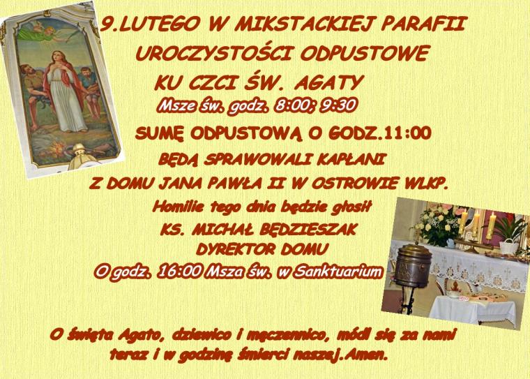 Zachował się tu jeszcze zwyczaj błogosławienia chleba, soli, wody. Tak będzie i w tym roku. Stało się już tradycja, że od 2008 roku w uroczystościach odpustowych ku czci świętej Agaty w Mikstacie uczestniczą Kapłani – emeryci z Domu Jana Pawła II w Ostrowie Wlkp. To właśnie oni sprawują co roku uroczystą sumą odpustową. W tym roku zostanie ona odprawiona 9. lutego o godz. 11:00 w kościele farnym pw. Świętej Trójcy w Mikstacie. Homilie w tym dni będzie głosił Ksiądz MICHAŁ BĘDZIESZAK, który od niedawna pełni funkcje Dyrektora w Domu Jana Pawła II w Ostrowie Wielkopolskim. Nad mikstacką społecznością czuwa Trójca Przenajświętsza, święty Rocha, ale także święta Agata. Może więc warto bliżej poznać Jej życie. Uroczystości odpustowe są właśnie czasem refleksji nad życiem naszych Świętych Patronów. Czy przykład życia świętej Agaty, młodziutkiej męczennicy, która mając zaledwie 16 lat oddała życie za wiarę może nas ludzi żyjących w XXI wieku, czegoś nauczyć, czy może mobilizować do pracy nad sobą? Z pewnością tak. W książeczce " Święta Agata" z serii Skuteczni Święcie czytamy:" Agata samym nawet imieniem zachęca, by wszyscy chętnie do niej się uciekali. swoim zaś przykładem poucza, by wszyscy ludzie nie zwlekając, podążali wraz z nią ku prawdziwemu Dobru, którym jest sam Bóg"