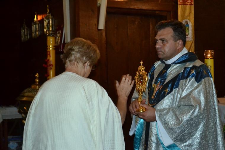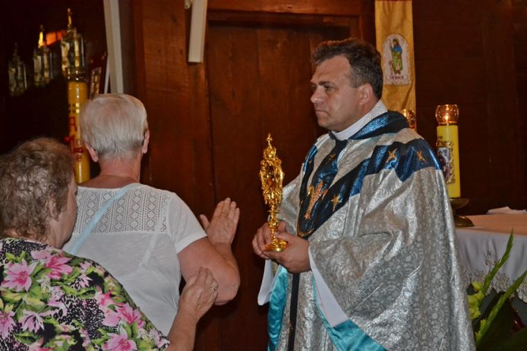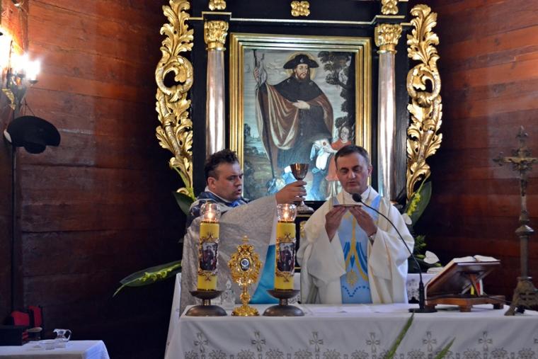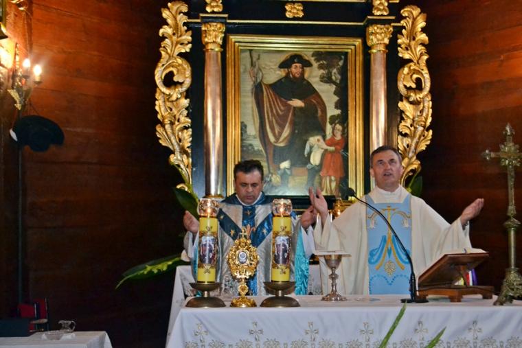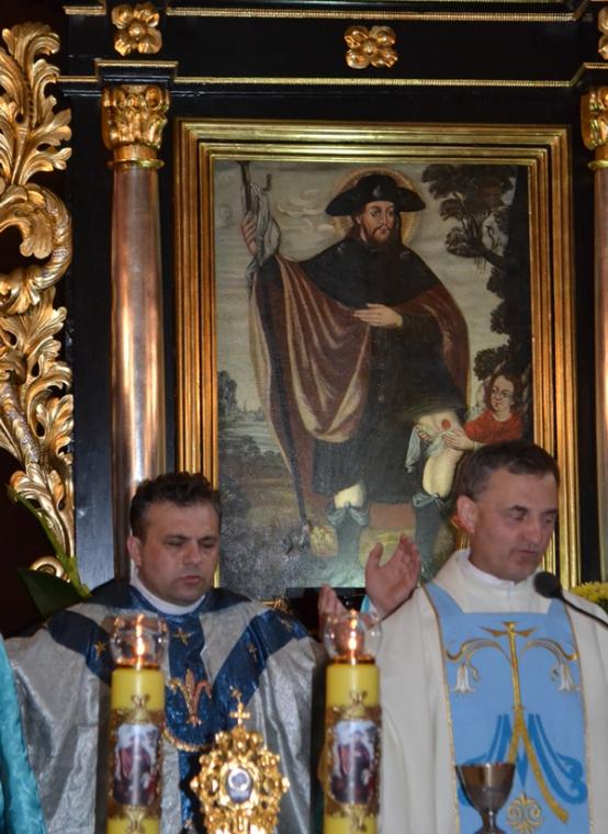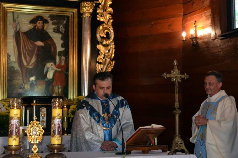 O godz. 18:30 sprawowana była w sanktuarium Eucharystia, której przewodniczył ks. kan. Adam Kosmała, proboszcz parafii rzymskokatolickiej pw. Narodzenia Najświętszej Maryi Panny w Kotłowie. Współcelebransem był ks. kan. Krzysztof Ordziniak. Mszę św. tradycyjnie już w tym przedodpustowym czasie poprzedził śpiew Godzinek o św. Rochu Wyznawcy. Ksiądz kan. Adam wygłosił do zebranych homilię. Przedmiotem rozważania było błogosławieństwo zawarte w słowach „ Błogosławieni, którzy się smucą, albowiem oni będą pocieszeni…”