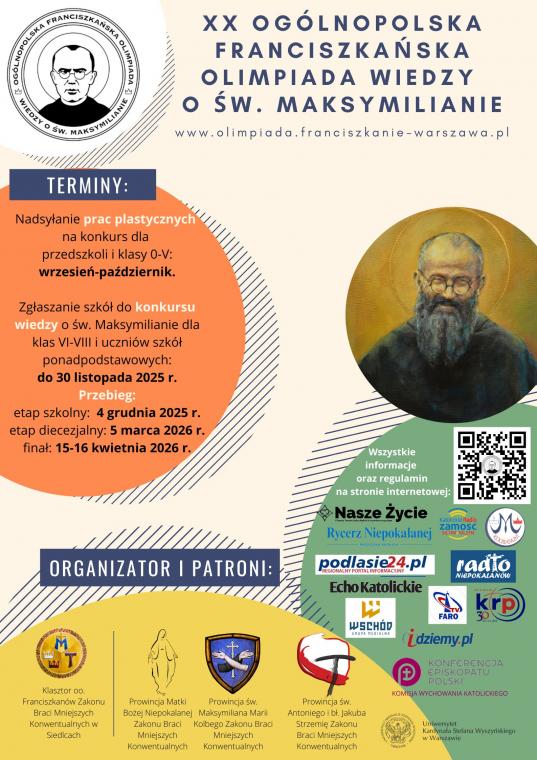 W konkursie plastycznym zadaniem uczniów jest zilustrowanie wybranego przez Organizatorów wydarzenia z życia św. Maksymiliana, natomiast w konkursie wiedzy uczniowie muszą przyswoić sobie życiorys św. Maksymiliana na podstawie wyznaczonej lektury oraz zapoznać się z podaną księgą Pisma Świętego. Uczestnicy Olimpiady mogą wygrać cenne nagrody (w przypadku konkursu wiedzy jest to wysokiej klasy sprzęt elektroniczny oraz indeksy na studia). Zgłoszenia uczestnictwa w Olimpiadzie dokonuje katecheta lub inny nauczyciel z danej szkoły na początku roku szkolnego. Regulamin Olimpiady, formularz zgłoszeniowy oraz szczegółowe informacje dostępne są na stronie olimpiada.franciszkanie-warszawa.pl. Pytania można kierować na adres: olimpiada@franciszkanie-warszawa.pl