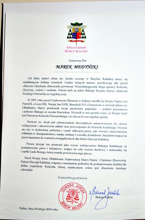 Trudno wymienić wszelkie formy aktywności Pana Marka w naszej wspólnocie parafialnej. Ksiądz. proboszcz wystosował prośbę do ks. bpa Edwarda Janiaka o nadanie długoletniemu organiście, kapelmistrzowi Panu Markowi Medyńskiemu odznaczenia diecezjalnego pierścienia św. Józefa. Ks. biskup przychylił się do tej prośby i podczas mszy św. dziękczynnej ks. proboszcz przekazał srebrny pierścień Panu Markowi. W piśmie skierowanym do odznaczonego czytamy: „ Proszę przyjąć ten pierścień jako wyraz wdzięczności Biskupa Kaliskiego za podejmowane pracy i inicjatywy, mające na celu wzrost duchowy i materialny tej cząstki Ludu Bożego, która została powierzona jego pieczy”.