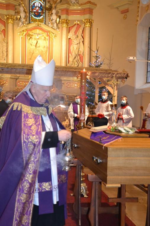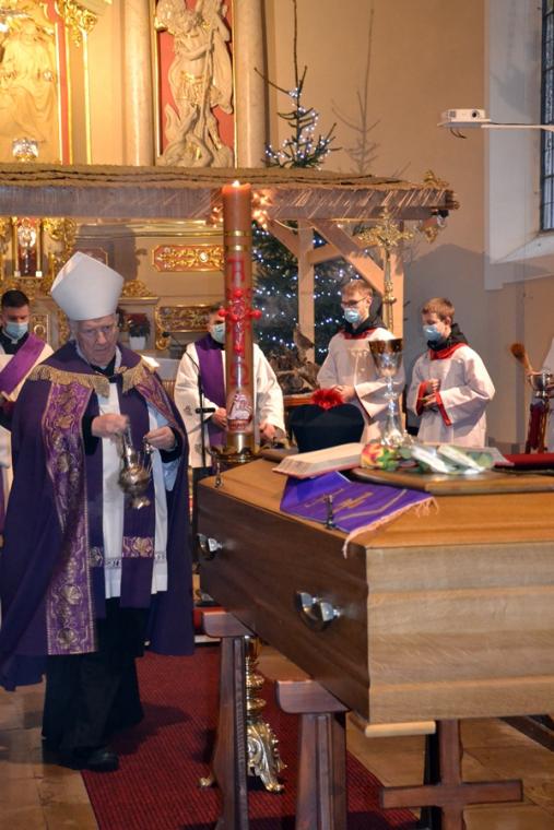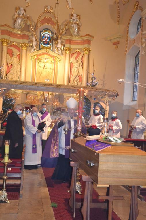 Kończąc homilię ks. biskup Ignacy powiedział: „Spoczywaj w pokoju dobry kapłanie, przyjacielu, Boga, człowieka, stron rodzinnych, prawdy, dobra i piękna. Przyjacielu mądrości i radości. Dołącz do grona świętych mężów w niebie. Niech Maryja, którą miłowałeś na ziemskich drogach Twojego życia niech Cię teraz przytuli do swojego matczynego serca i zaprowadzi do Jezusa. Wierzymy, że swoją chorobą, cichym cierpieniem spłaciłeś już dług swoich słabości i znajdziesz Boże miłosierdzie, któremu zawsze ufałeś. My się dziś za Tobą wstawiamy w tej świątyni przed Panem i mówimy spoczywaj w pokoju. Do zobaczenia w wieczności. Amen”.