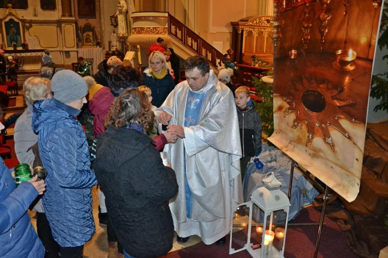 Po zakończeniu mszy świętej, przy banerze przedstawiającym Grotę Narodzenia Pana Jezusa ks. proboszcz zapalał świece, lampki przyniesione przez wiernych. Wiele osób zabrało do swoich domów Betlejemskie Światło Pokoju. Stojące przy ołtarzu w kościele i zaniesione do naszych domów Betlejemskie Światło Pokoju przypomina nam, że Pan jest już blisko, naprawdę blisko. Mobilizuje nas ono do czuwania i oczekiwania wraz z Maryją Józefem na przyjście Pana.