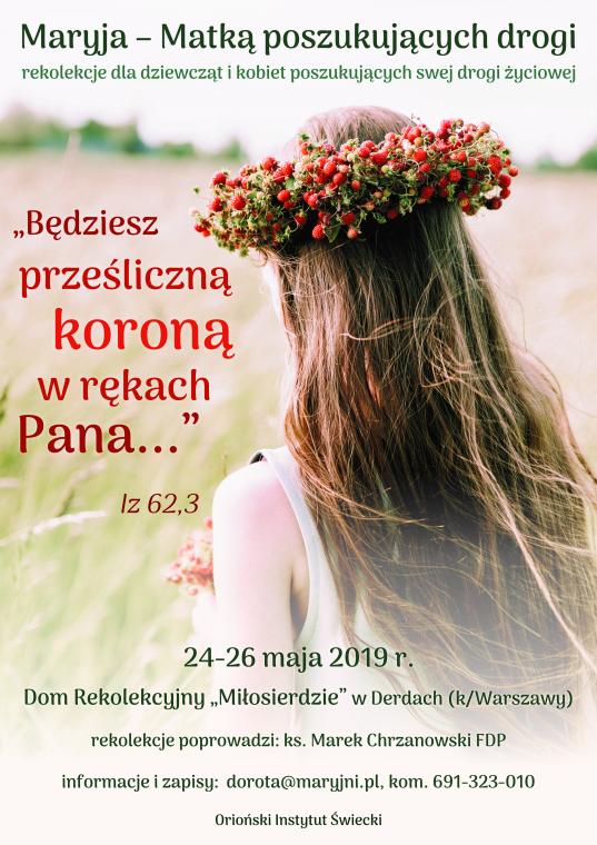 "Będziesz prześliczną koroną w rękach Pana…” – to tytuł kolejnych rekolekcji z cyklu "Maryja - Matką poszukujących drogi". Tym razem będą one miały miejsce od 24 do 26 maja w domu „Miłosierdzie” Sióstr Matki Bożej Miłosierdzia w Derdach (k/Warszawy - ul. Łączności 158 - przystanek autobusowy w Łazach - dojście ok. 15 min). Rekolekcje poprowadzi ks. Marek Chrzanowski FDP.