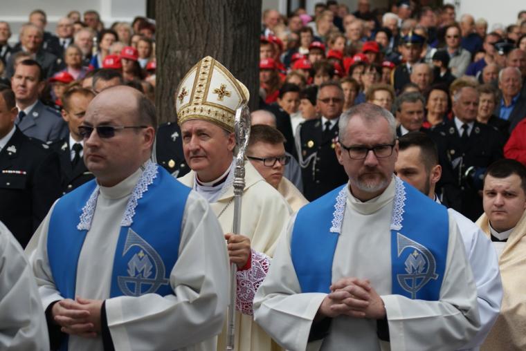 Jego Ekscelencja bp Andrzej Jeż rozpoczął homilię od przybliżenia wiernym znaczenia noszonego przez różnego rodzaju służby munduru. Podkreślił, że dzięki niemu poznajemy człowieka, ponieważ każdy mundur coś oznacza – charakteryzuje osobę, która go nosi. Biskup tarnowski określił obraz Matki Bożej Tuchowskiej terminem tzw. „Pneumatofora”, oznaczającego „Nosicielkę Ducha Świętego”, zaznaczając jednocześnie, że Matka Boża jest całkowicie stworzona i przeniknięta przez Ducha Świętego. To Jemu jest w pełni oddana i posłuszna. Kaznodzieja podkreślił, że Duch Święty – jako niewidoczny duch – porusza nami, daje nam siłę, energię i żywotność – na różnych poziomach i w różnych sytuacjach naszego życia. To właśnie On zapala w nas pragnienie, aby wbrew instynktowi samozachowawczemu pomagać, sięgać heroizmu, ryzykując nawet utratę własnego życia. Ordynariusz tarnowski podkreślił, że Matka Boża, jako jedyna z ludzi, była niezawodnym instrumentem w rękach Ducha Świętego, dlatego nazywano ją „Harfą Ducha Świętego”. Całe jej życie było pieśnią o nieskazitelnej harmonii życia i relacji do Ducha Świętego. Na tle Matki Bożej widzimy, jak wiele nam brakuje do wydawania czystego, harmonijnego tonu i jak wiele pracy jest jeszcze przed nami. Przychodzimy i przychodźmy zatem do naszej Matki, aby się w Nią wpatrywać, uczyć, jak harmonizować swoje życie duchowe. Należy również pamiętać, aby nieustannie odnawiać w sobie świadomość, że jesteśmy napełnieni Duchem Świętym, a naszym głównym zadaniem – jako osób wierzących – jest głosić ewangelię, tak jak Maryja, która szła przekazać Elżbiecie dobrą nowinę. Na koniec homilii bp Andrzej Jeż wyraził swoją wdzięczność ojcom redemptorystom za ich 125-letnią posługę w tuchowskim sanktuarium. Dziękował również za codzienną ofiarność i heroizm siostrom zakonnym, małżeństwom oraz licznie zgromadzonym na placu sanktuaryjnym służbom mundurowym. Służebnico Ducha Świętego módl się za nami!
