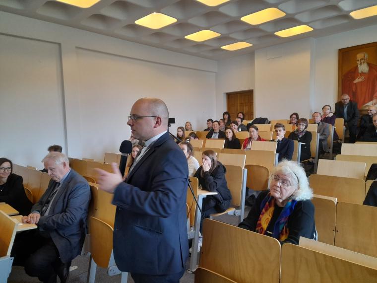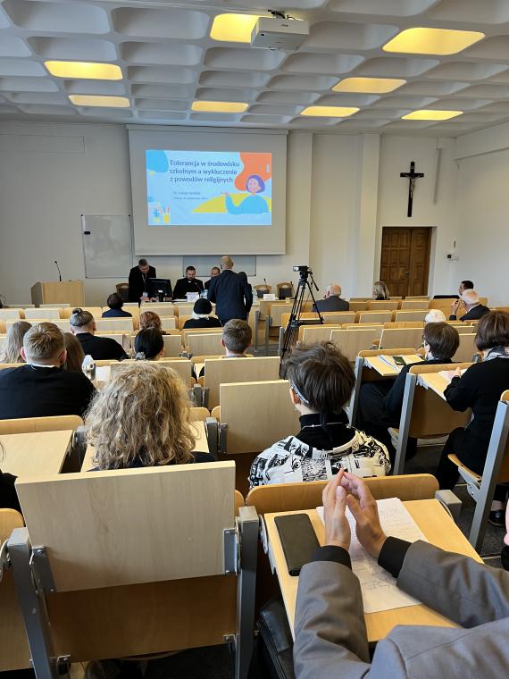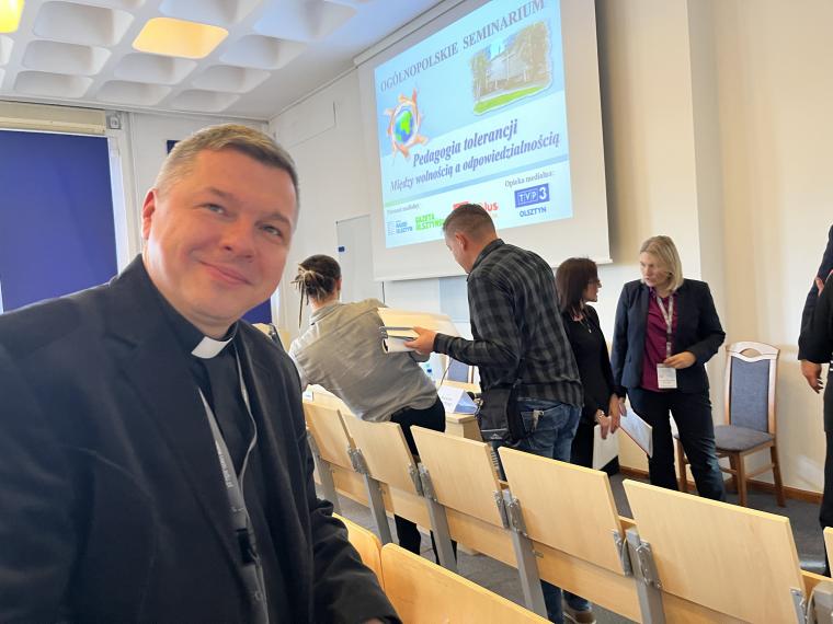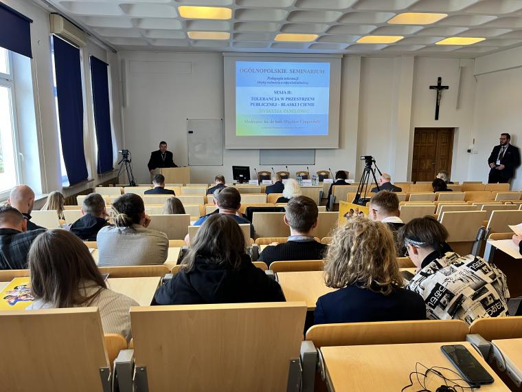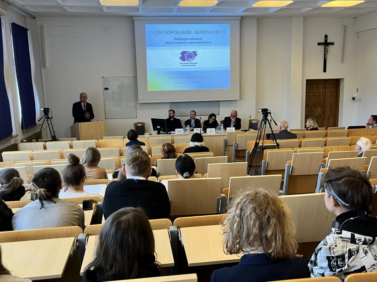 Zostało ono zorganizowane przez Katedrę Teologii Pastoralnej i Katechetyki we współpracy z Uniwersytetem Opolskim i Uniwersytetem Marii Curie-Skłodowskiej w Lublinie. Seminarium odbyło się w ramach projektu „Pedagogia tolerancji. Podążając za Karolem Wojtyłą”, realizowanego przy wsparciu Ministra Edukacji i Nauki w programie Społeczna Odpowiedzialność Nauki (nr projektu SONP/SP/461712/2020). Kierownikiem projektu jest ks. prof. dr hab. Zygfryd Glaeser z Wydziału Teologicznego Uniwersytetu Opolskiego, a wykonawcami w tym projekcie są: prof. dr hab. Anna Zellma z Wydziału Teologii UWM w Olsztynie i prof. dr hab. Jan Pomorski z Uniwersytetu Marii Curie-Skłodowskiej w Lublinie. Patronat honorowy objęli: Warmińsko-Mazurski Kurator Oświaty w Olsztynie, Komisja Wychowania Katolickiego Konferencji Episkopatu Polski i Stowarzyszenie Katechetyków Polskich. W seminarium udział wzięli liczni przedstawiciele grona pedagogicznego i środowiska akademickiego z całej Polski, w tym dyrektorzy szkół, nauczyciele, pedagodzy, katecheci, psycholodzy szkolni, dyrektorzy wydziałów katechetycznych, przedstawiciele mediów. Główną osią dyskusji była pedagogia tolerancji inspirowana nauczaniem Jana Pawła II, w której istotne miejsce zajmuje fundament aksjologiczny. W ramach seminarium poszukiwano odpowiedzi na pytania: czym jest właściwie rozumiana postawa tolerancji i jak ją praktykować na co dzień? Podjęto dialog z przedstawicielami różnych środowisk naukowych i wychowawczych (rodziny, szkoły, Kościoła, mediów) w celu wymiany doświadczeń w zakresie towarzyszenia młodym w kształtowaniu postawy tolerancji. Prelegenci i uczestnicy wspólnie debatowali nad tym, jakie są współczesne wyzwania w zakresie wychowania do tolerancji pozytywnej oraz co zrobić, aby wspólnie działać na rzecz promocji tolerancji inspirowanej nauczaniem Jana Pawła II. W pierwszym dniu odbyły się dwie sesje tematyczne. Pierwszą sesję moderował ks. dr hab. Andrzej Kielian (UPJPII). Tematyka koncentrowała się wokół tolerancji w rodzinie i szkole. Ks. dr hab. Dariusz Kurzydło, prof. UKSW interesująco przedstawił znaczenie rodziny w wychowaniu do tolerancji. Przypomniał, że rodzina jest pierwszą i znaczącą szkołą tolerancji. Szacunek do drugiego człowieka i do własnych korzeni, aktywne słuchanie siebie nawzajem, dzielenie się odpowiedzialnością, współdziałanie, akceptacja starości i przyjęcie nienarodzonego życia odgrywają ważną rolę w kształtowaniu postawy tolerancji pozytywnej w rodzinie. Przyczyniają się do budowania „nowej kultury życia” (EV 22). Ks. dr Łukasz Simiński (UMK, WSD w Pelplinie) wygłosił referat pt. Tolerancja w środowisku szkolnym a wykluczenie z powodów religijnych. Współczesna szkoła – jak trafnie zauważył – stawia wychowawców i wychowanków nie tylko wobec wyzwań w zakresie tolerancji religijnej, ale wobec szeroko rozumianego wykluczenia z powodów religijnych zarówno w gronie nauczycieli, jaki i uczniów. Rozważania teoretyczne ks. dr Ł. Simiński wzbogacił o interesujące odwołanie do wyników badań empirycznych, zarówno ilościowych, jak i jakościowych, w tym do studium przypadków. Wskazał na potrzebę otwartości na wychowanków, wczuwania się w ich środowisko, bycia z nimi, słuchania ich, prowadzenia dialogu, budowania relacji opartych na prawdzie i miłości oraz uczenia wrażliwości na odmienność drugiego człowieka. Do tematyki referatów bezpośrednio nawiązano w dyskusji, zwracając uwagę na nowe wyzwania w zakresie kształtowania postawy tolerancji pozytywnej. Krzysztof Marek Nowacki, Warmińsko-Mazurski Kurator Oświaty w Olsztynie, zabierając głos w dyskusji przypomniał, że „życie rodziców to jest książka podstawowa, którą czyta dziecko” (św. Augustyn). Wskazał na potrzebę pedagogizacji rodziców. Przypomniał o potrzebie oparcia tolerancji na fundamencie chrześcijańskich wartości i wyraźnego sprzeciwu wobec permisywizmu i polaryzacji społecznej. Zaznaczył też, że w kształtowaniu postawy tolerancji pozytywnej ważną rolę odgrywa samo spotkanie z drugim człowiekiem na różnych poziomach istnienia, szacunek drugiego człowieka i jego godności, otwartość, roztropność, wrażliwość społeczna, miłości do Boga, drugiego człowieka i ojczyzny. Uczestnicy dyskusji, reprezentujący różne środowiska wychowawcze i naukowe, dzielili się też osobistym doświadczeniem, zwracając uwagę na brak pogłębionej refleksji nad znaczeniem słowa „tolerancja”, utopijną wizję miłości i szacunku wobec każdego człowieka, każdego jego zachowania, postawy, poglądów i przekonań. Za kluczowe uznali stwarzanie dzieciom i młodzieży możliwości w zakresie prowadzenia dialogu, umiejętność empatycznego słuchania oraz okazywania wzajemnego szacunku i obdarowania się dobrem. Współczesny wychowawca ma być człowiekiem otwartym, odpowiedzialnym, zdolnym do obrony wartości i sprzeciwu wobec zła.