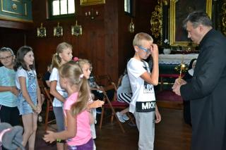 Jak okazało się w drugim dniu spotkań, dzieci sumiennie wykonały pracę domową. Było jeszcze jedno zadanie, gdyż w trakcie tegorocznej Szkoły pojawił się kufer dziedzictwa. Podczas poszczególnych dni dzieci będą wkładały do niego rysunki, fotografie, opisy, tego co składa się na nasze dziedzictwo kulturowe. Na początek dzieci miały przyjrzeć się dziedzictwu należącemu do nich. Kufer w czwartkowe przedpołudnie zaczął się wypełniać. W tym drugim dniu w Rochowej Szkole był oczywiście czas na modlitwę nowennową podczas której ks. kan. Krzysztof odczytywał przyniesione przez młodych intencje. Potem dzieci uczciły relikwie św. Rocha. Po modlitwie przyszedł czas na wspólny śpiew. W jego prowadzeniu niezastąpiona okazała się s. Małgorzata, która pewnie już do końca spotkań w Rochowej Szkole będzie dbała o to, by rozśpiewać dzieci, a także organizować dla nich zabawy ruchowe.Ta wakacyjna szkoła została zorganizowana m.in. po to, by dzieci poznały życie św. Rocha, a także wartości, którymi kierował się On w swoim życiu. W tym celu ksiądz kustosz wykorzystał fragment programu „Ziarno” poświęconego św. Rochowi. Dodajmy, że fragmenty tego programu były realizowane na terenie naszej parafii. Uczestniczyli w nim młodzi Mikstaczanie. W drugim dniu omówione zostały atrybuty, z którymi na obrazach i rzeźbach przedstawiany jest św. Roch. Stało się to impulsem do wskazania podobieństw i różnic w ikonograficznych przedstawieniach św. Rocha i św. Jakuba. Podczas spotkania dzieci obejrzały film animowany „N- jak niewidomy”, w którym mogły zobaczyć w jaki sposób można pomagać osobom niewidomym bądź niedowidzącym. Ksiądz kustosz omawiając strój św. Rocha zwrócił uwagę na laskę pielgrzymią. Z filmu dzieci dowiedziały się, że biała laska może być bardzo pomocna dla osoby niewidomej. Nie zabrakło także opowieści o psach przewodnikach osób niewidomych. Film był forma przygotowania do spotkania z gościem, który tego dnia odwiedził uczestników Szkoły Świętego Rocha. Mamy nadzieję, że spotkanie to na długo pozostanie w ich pamięci. Kim był ten niezwykły gość? Otóż na spotkanie z młodymi przybyła Pani Gabriela Przygoda. Pani Gabriela jest osobą niewidomą, straciła wzrok mając 20 lat. Podczas spotkania Pani Gabrysia przedstawiła się w kilku zdaniach, a następnie bardzo chętnie odpowiadała na pytania młodych, trzeba przyznać, że było ich bardzo wiele. Młodzi pytali m.in. o to jak radzi ona sobie z czynnościami dnia codziennego takimi jak sprzątanie, gotowanie, prasowanie, mycie, poruszanie się po mieszkaniu, dobieranie kolorystyki ubrania, pakowanie walizki na wyjazd. Pani Gabrysia podkreślała, że pomocne są tu często zdobycze techniki. Podkreśliła, że osoby niewidome mają z reguły bardzo uporządkowane życie. Troska o ład ułatwia im funkcjonowanie, gdyż wiedzą wtedy gdzie mogą znaleźć konkretne przedmioty. Jest jeszcze jedna rzecz, którą należy powiedzieć o gości. Pani Gabriela została obdarowana przez Pana Boga pięknym głosem. Dane nam było posłuchać w sanktuarium pieśni Ave Maria Jasnogórska Pani. Może kiedyś uda się Pani Gabrysi wydać płytę, życzymy jej tego z całego serca. Po licznych pytaniach zadanych przez młodych ksiądz kan. Krzysztof zapytał Panią Gabrysię co chciałaby powiedzieć młodym ludziom. Zacytujmy to przesłanie: „Żeby żyli każdym dniem, żyli tak, żeby nikt przez nich nie płakał, bo jeżeli jest się młodym nie zwraca się uwagi na to co się robi, krzywdzi się ludzi, to to wszystko potem wraca, jeżeli się ich nie krzywdzi, a stanie się nam krzywda to ma się pomoc z każdej strony, ale jeśli się tego nie zauważa i tego nie robi to wtedy jest naprawdę ciężko”.