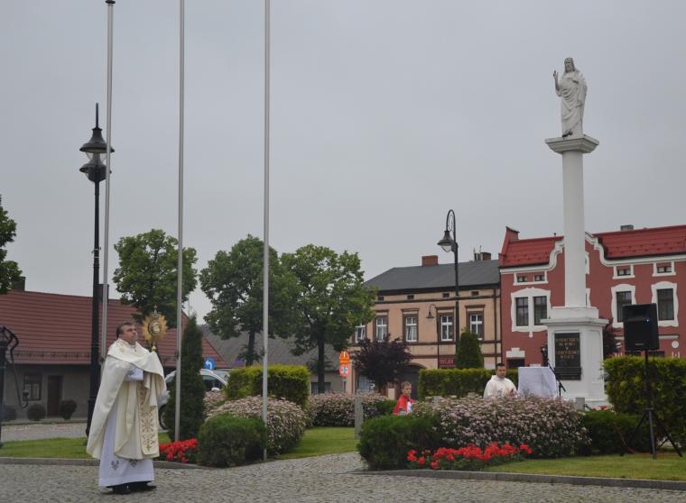Na rynku została odmówiona litania do Najświętszego Serca Jezusowego.  Od kilku lat w uroczystość Najświętszego Serca Pana Jezusa na rynku wybrzmiewają - tak jak w dniu poświęcenia figury - słowa aktu zawierzenia. W szczególnym czasie doświadczania przez nas epidemii zostały wypowiedziane przez ks. proboszcza. Przypomniały nam one o zobowiązaniach przyjętych przez naszych przodków, ale  jakże  aktualnych dla nas  żyjących współcześnie. Przypomnijmy fragment tego aktu poświęcenia się miasta:  „Przychodzimy więc dzisiaj, by uznać całkowite panowanie Twoje nad miastem naszem. Chcemy odtąd Twojem życiem żyć, chcemy w sobie te cnoty pielęgnować, za które już tu na ziemi pokój obiecałeś(...). Panuj więc nad naszym rozumem przez prostotę wiary, panuj też przez swa miłość nad sercami naszemi, które niech całkowicie nią zapłoną. Chcemy je w Twej żarliwej miłości utrzymać przez częste przyjmowanie Komunii św. Racz, Boskie Serce, przewodzić naszym zebraniom, błogosław nasze duchowne i doczesne przedsięwzięcia, rozpraszaj nasze troski, uświęcaj nasze pociechy i łagódź nasze cierpienia”.