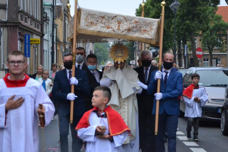 Po Mszy Świętej udaliśmy się w procesji  z Najświętszym Sakramentem na Rynek.  Nie mogło zabraknąć sztandarów, feretronów, dzieci niosących poduszki z symbolami eucharystycznymi i oczywiście dziewczynek sypiących kwiatki przed  niesionym przez kapłana w monstrancji Jezusem ukrytym pod postacią Chleba.