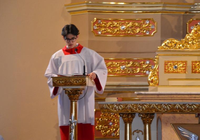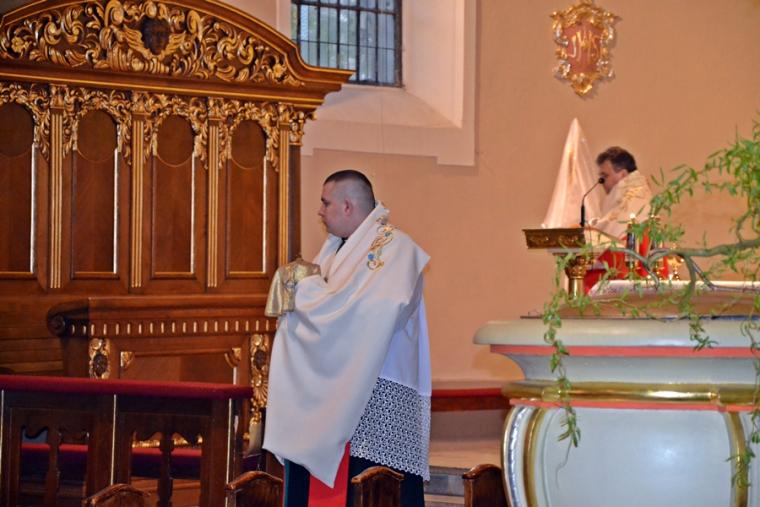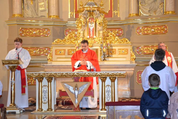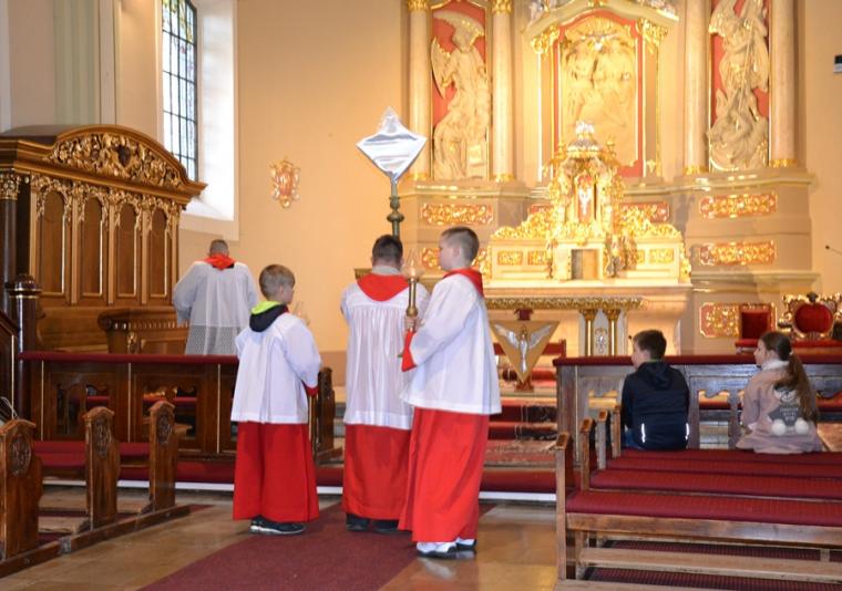 Liturgii Wielkopiątkowej przewodniczył ks. kan. Krzysztof Ordziniak. Niezwykła cisza i modlitewna zaduma zapanowała w kościele, gdy kapłan w tzw. geście właściwym Wielkiego Piątku leżał krzyżem przed ołtarzem. Podczas liturgii wielkopiątkowej odczytany został opis Męki i Śmierci Pana Jezusa. Podczas liturgii wielkopiątkowej kilka słów refleksji na temat krzyża w życiu człowieka skierował do licznie zebranych w świątyni wiernych ks. kan. Krzysztof. Kapłan zaakcentował, że Wielki Piątek jest dniem krzyża. Wskazał, że Kościół zatrzymuje się, aby ukazać ludziom cenę, za jaka Chrystus nas zbawił. Dodał jednak, że milczenie Wielkiego Piątku nie jest milczeniem rozpaczy, ale zadumy i refleksji nad miłością, która jest zdolna do największej ofiary. Kaznodzieja zachęcał zebranych do modlitwy i postawienia sobie pytania, czy potrafimy przyjąć krzyż. Krzyż, jak podkreślał, stoi w centrum Liturgii. Zwrócił uwagę na obnażony ołtarz, na którym brakuje obrusów, świeczników, kwiatów. Był natomiast pewien bardzo ważny gest. Powiedział: „celebrans(…) padł na twarz. To przejmujący znak modlitwy księdza leżącego na posadzce kościoła- jak podczas święceń kapłańskich. Trochę tak, jakby liturgia chciała nam przypomnieć, że bycie księdzem, bycie chrześcijaninem, jest powiązane z wejściem w tajemnicę Krzyża”. W dalszej części rozważania kapłan przywołał obraz znajdujący się w starym klasztorze. Przedstawia on Jezusa niosącego wielki krzyż, a wokół Niego wielu ludzi z małymi krzyżykami w ręku. Kapłan wskazał, że każdy człowiek ma swój krzyż. Podkreślił, że autor tego obrazu chciał ludziom przypomnieć słowa Chrystusa: „ Jeśli kto chce pójść za Mną, niech się zaprze samego siebie, niech weźmie krzyż swój i niech Mnie naśladuje”. Kontynuując, ks. proboszcz Krzysztof podkreślał potrzebę podjęcia swego krzyża i podążania z nim za Chrystusem. Wskazał na wielorakość i różnorodność krzyży, które trzeba przyjąć w swoim życie. Jest ich tak wiele, jak wielu jest ludzi. Zwrócił uwagę na krzyż samotności, zdrady, odrzucenia, choroby, nieszczęśliwych wypadków, śmierci bliskich. Kontynuując powiedział: „Krzyż ma wiele imion. Jedno jest pewne: trzeba podjąć swój krzyż, aby upodobnić się do Chrystusa. Kto nie bierze swego krzyża, nie jest Mnie godzien - mówi Jezus”. Kapłan zwrócił uwagę wiernych, że aby zrozumieć i podjąć swój krzyż, trzeba zrozumieć krzyż Chrystusa. To z niego mamy czerpać siłę i moc. W końcowej części rozważania kapłan przywołał postać Karola Antoniewicza, autora pieśni: „ W krzyżu cierpienie, w krzyżu zbawienie…”. Wskazał trudne koleje jego życia: śmierć dzieci, żony. Jego żona w czasie choroby mówiła do niego: „Karolu, trzeba głośno dziękować, a cicho cierpieć”. Po jej śmierci wstępuje do jezuitów. Ma dar przemawiania do cierpiących. W czasie epidemii z wielkim oddanie posługuje chorym. Sam się zaraża i tuż przed śmiercią pisze pieśń „ W krzyżu cierpienie, w krzyżu zbawienie, w krzyżu miłości nauka…”