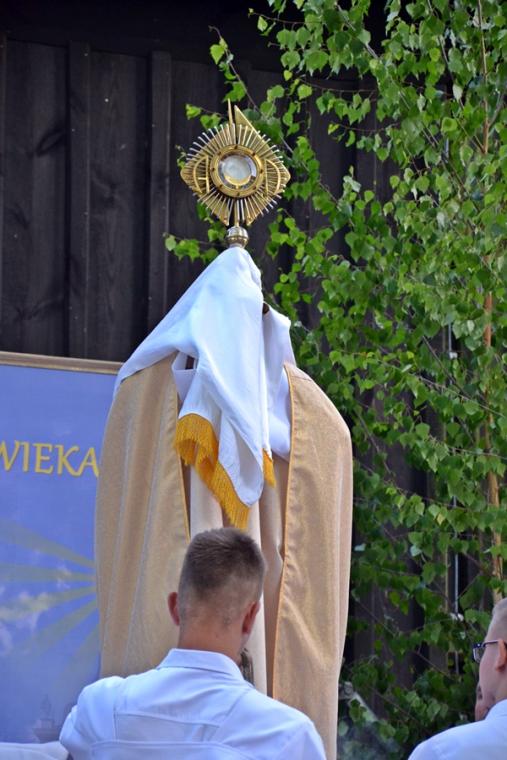 Homilię w czasie tej Eucharystii sprawowanej m.in. w intencji wszystkich obsługujących procesje i przygotowujących ołtarze wygłosił ks. kan. Krzysztof Ordziniak. Na początku kaznodzieja zauważył, że bardzo licznie zgromadzili się w tym dniu wierni w sanktuarium i wokół niego. Zaznaczył, że Chrystus, który jest bogaty w miłosierdzie pochyla się nad każdym człowiekiem, nad każdą ludzką nędzą ukazując mu swe serce pełne miłości. Ksiądz kan. Krzysztof podkreślił, że Bóg nieustannie zaprasza nas byśmy korzystali z Jego miłosierdzia, wskazując, że jest ono jedynym ratunkiem dla człowieka i świata. Zaznaczył, że współczesny człowiek bardzo potrzebuje Bożego przebaczenia, Bożej miłości i obecności. Doświadczenie Bożego miłosierdzia powinno mobilizować nas do miłości do Boga i bliźnich. Celebrans zwrócił uwagę, że Chrystus nieustannie mnoży dla nas swój Chleb. Gdy przyjmujemy Go w Komunii Świętej obdarza nas potrzebnymi siłami, doświadczamy Jego obecności, która jest źródłem otuchy, siły, odwagi.